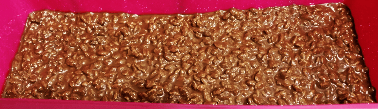 Cuando lo saquéis del microondas, lo removéis para que se mezclen bien los chocolates y quede una pasta homogénea. Después, añadís el arroz inflado, lo mezcláis bien y colocáis la masa en un molde alargado.