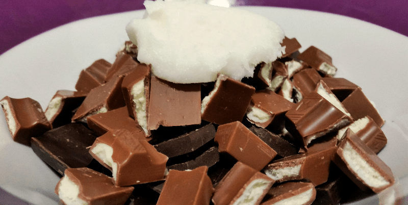 El primer paso es coger los dos tipos de chocolates y trocearlos en un bol apto para microondas. A continuación, añadís la manteca de cerdo y lo metéis todo en el microondas a máxima potencia durante 2 minutos.