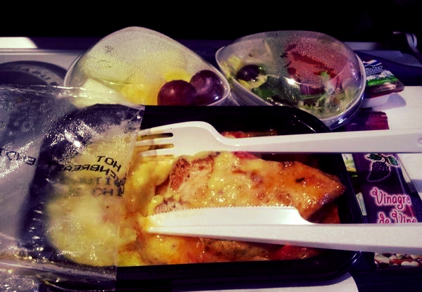 El viaje lo hice con US Airways, avisando previamente a través de su servicio de atención telefónica que necesitaba que mi comida fuera sin gluten. Tampoco tuve ningún problema en ese sentido y me sirvieron el pollo con puré de patatas, ensalada y fruta que veréis a continuación. Era comida de avión, así que no estaba especialmente buena, pero igual que la que lleva gluten, así que ninguna queja.