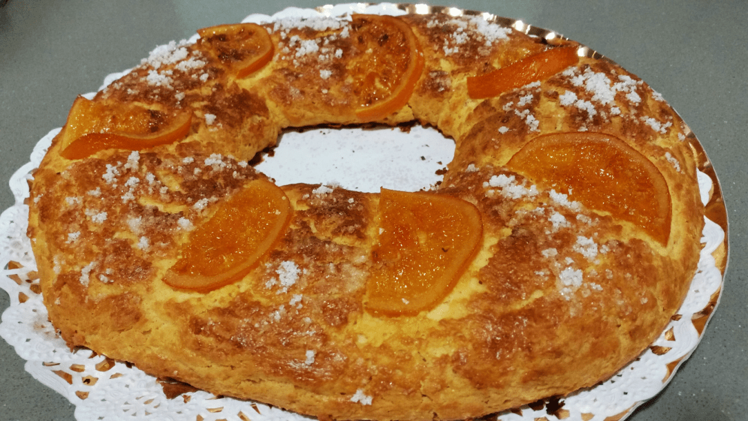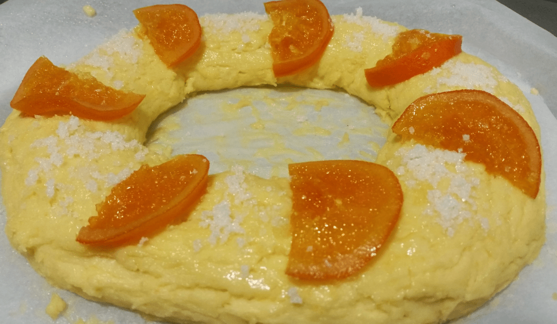 Ahora llega el momento de decorar el roscón. Yo le puse naranja confitada que había elaborado previamente un par de días antes. Es tan fácil como cortar una naranja en rodajas finitas y meterla en agua hirviendo a fuego muy lento y con abundante azúcar. Las debéis tener hasta que veáis que la parte blanca de las naranjas se vuelve como transparente. Después las sacáis y las dejáis escurrir en la rejilla del horno hasta que se sequen. Tardan bastantes horas en secarse, así que hacedlo con previsión.