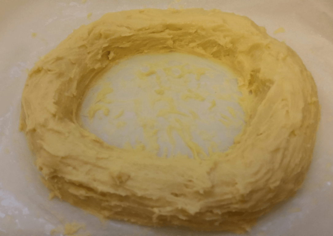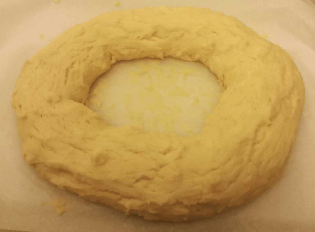 Una vez tenéis la masa, la sacáis de la cubeta y la colocáis sobre unas hojas de papel de horno untadas previamente con aceite de girasol para que no se os pegue. Os untáis las manos también con el aceite de girasol para poder manipular bien la masa y le dáis la forma de roscón. Dejad un agujero bien grande, ya que cuando la masa crezca, se os irá cerrando. Además, si lo que queréis hacer es el Roscón de Reyes, este es el momento de meter las figuritas dentro de la masa (que queden bien cubiertas).