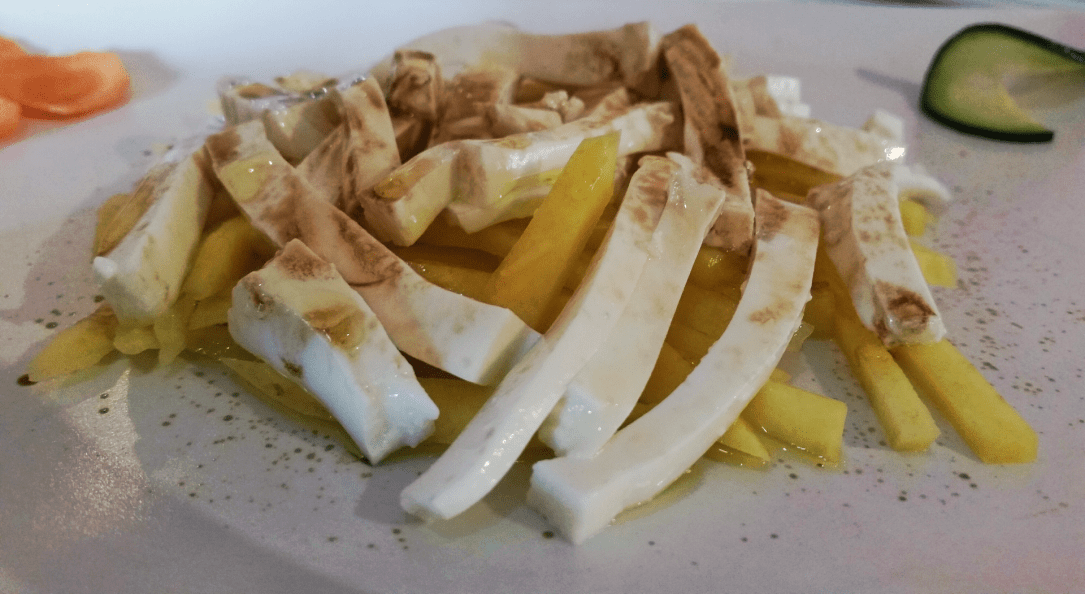A partir de aquí todo fue como la seda. El chico que vino a tomar nota fue informado de que era celíaca y me generó confianza. Me trajeron el pan sin gluten y me indicaron que no podía comer del pequeño aperitivo que trajeron para los demás. Después de examinar la carta, me decanté por pedir media ración de la ensalada de mango y queso fresco de primero, y de segundo tomé el caldero de arroz con verduras. No tomé postre, pero el camarero me contó que tienen unos brownies sin gluten (si no recuerdo mal).