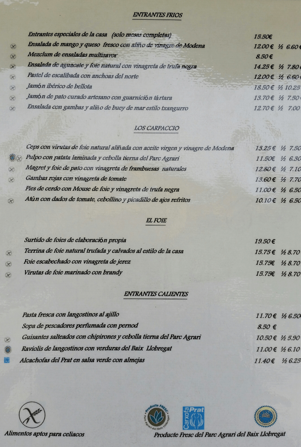 Mi visita a Cal Mingo empezó por casualidad (el restaurante al que tenía previsto ir estaba cerrado cuando llegamos), así que fui allí con poca información previa y sin tener claro si podría comer con seguridad. Al llegar, pregunté a uno de los camareros si, como había leído, ofrecían platos sin gluten. El tipo me miró como si fuera un alien y le acabara de decir que venía de Urano, y me preguntó qué podía comer. Entonces yo le miré a él con cara de «pero qué me estás contando» y pensé en darle una breve explicación con la idea de ir a buscar ya otro restaurante. Entonces va y me enseña una carta en la que venían indicados perfectamente los platos sin gluten. Ante mi sorpresa, le pregunto si tienen un buen control de la contaminación cruzada y me dice que sí, que no me preocupe, y que también tienen pan y cerveza sin gluten (después vi que en la puerta tienen un logo que indica que pertenecen a la Asociación de Celíacos de Catalunya). Vamos, que llegué a la conclusión que el camarero pretendía gastarme una broma al inicio de nuestra conversación, porque si no no lo entiendo. Pero vaya, que le perdoné porque seguramente no sabe que es mejor no bromear con un celíaco hambriento 🙂