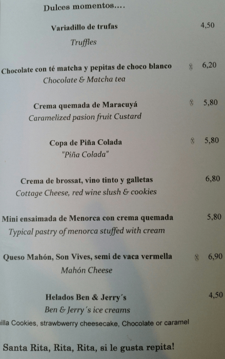 Antes de terminar el post, os quería comentar también que en Maó encontré otro restaurante en el que también tienen la carta adaptada para celíacos. Se llama Santa Rita y está céntrico. No llegamos a probarlo, pero os dejo las fotos del sitio. También deciros que, por lo que vi, es mucho más fácil encontrar lugares para nosotros por la zona de Maó que por Ciutadella, por si lo queréis tener en cuenta.