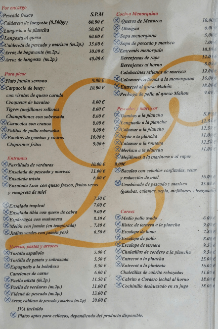 Aparte de esto, como he comentado antes, los demás días cocinamos en el apartamento, pero os dejo también un par de locales que encontré en los que sirven cerveza sin gluten: Tom’s Bar (Cala’n Bosch) y Ses Voltes (Ciutadella). Eso sí, en Ses Voltes no os molestéis en pedir ni una bolsa de patatas. No tienen y me ofrecieron una tapa de aceitunas a cambio. Cuando les pregunté por el tema del gluten, me miraron como la alienígena celíaca que soy. Así que tomaros la Daura y a otra cosa, mariposa.