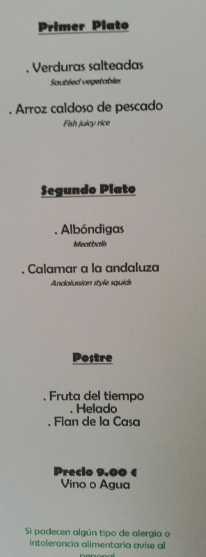 Con el chasco, nos fuimos a otra parte, concretamente a Ferreries, donde había leído que en el restaurante Loar (Avenida Virgen del Toro, 2) también ofrecían comida para celíacos. Y así fue. Es básicamente el restaurante del hotel Loar, de aspecto sencillo y un poco de batalla, pero donde encontraréis una atención exquisita y una carta adaptada casi al 100% para los celíacos. Entre semana cuentan con un económico menú del día. En el menú no vienen indicados los platos sin gluten, pero el camarero te informa de los que puedes o no comer (en mi caso, todo menos una cosa). Yo pedí el arroz caldoso de pescado, los calamares a la andaluza (que los adaptan y rebozan con harina sin gluten) y un helado de postre. Todo excelente.