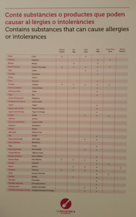 Otra opción que tenéis en Menorca es la cadena de helados Sa Gelateria, donde te marcan en un gran cartel todos los alérgenos de los helados. Todos menos cuatro son sin gluten. Aquí tenemos un pequeño problema, sin embargo. Al servir, y bajo petición, limpiaron bien la cuchara de los helados, pero las tarrinas son las que son y, si tocaron antes el helado de cookies y después uno de los que son sin gluten… pues contaminación cruzada al canto. Yo aquí me arriesgué. Mal hecho, lo sé. Soy muy estricta siempre con todo y esta vez no lo fui. También os diré que no me sentó mal y que… Estaban muy buenos!!!