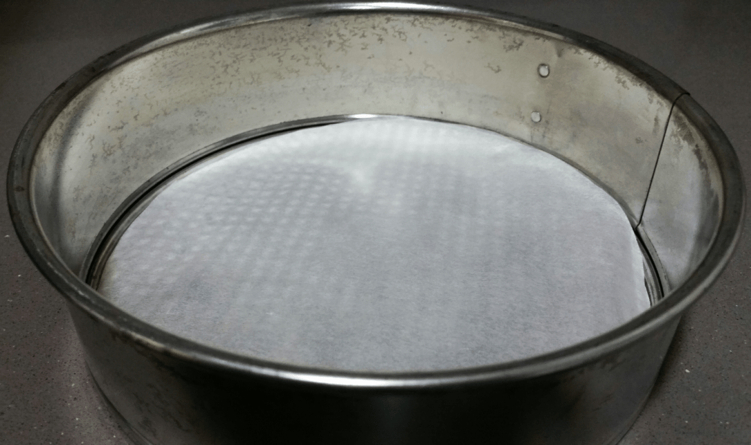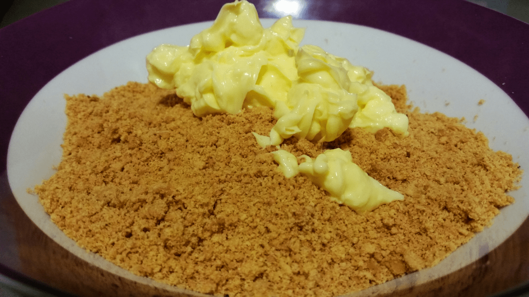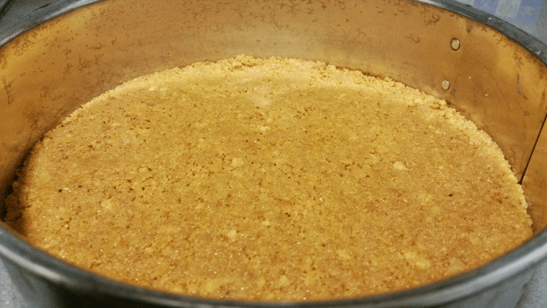 Lo primero que hay que hacer es coger los 200 gr. de galletas y triturarlas. Yo usé las galletas maría sin gluten de la marca Gullón, que tienen una textura bastante arenosa y eso hace que se deshagan muy fácilmente. Paralelamente, tenemos que haber derretido la mantequilla (lo mejor es calentarla al baño maría). A continuación, mezclamos bien la mantequilla con las galletas trituradas hasta formar una masa uniforme. Cogemos esa masa y la extendemos en la base del molde, que habremos forrado previamente con un poco de papel de horno. Ahora metemos el molde en la nevera para que se vaya solidificando la base de galleta mientras preparamos el resto del pastel.