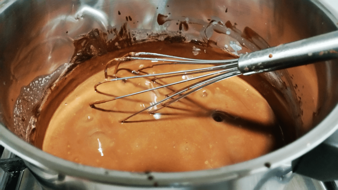 Vamos con la primera de las capas. En un recipiente, mezclamos 100ml. de leche con el sobre de cuajada y lo removemos bien hasta que la cuajada se deshaga sin que queden grumos. Por otro lado, echamos en una olla pequeña o un cazo los 200ml. de nata líquida más los otros 100 ml. de leche. Cuando ya esté un poco caliente, echamos los 150gr. de chocolate negro. Lo removemos hasta que el chocolate se haya deshecho y, a continuación, echamos también la leche con la cuajada. Lo llevamos a ebullición sin dejar de remover. Una vez hierva, lo retiramos del fuego, y lo volcamos con cuidado en el molde sobre la base de galleta. Lo dejaremos reposar mientras vamos preparando las siguientes capas. No hace falta que lo volváis a meter en la nevera, si lo dejáis a temperatura ambiente, es suficiente.