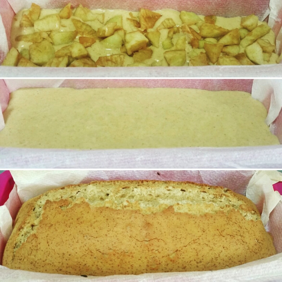 Ahora cogemos el molde (en mi caso, he usado uno alargado) y volcamos la mitad de la masa en él. Después vertimos los trocitos de manzana y, a continuación, el resto de la masa.