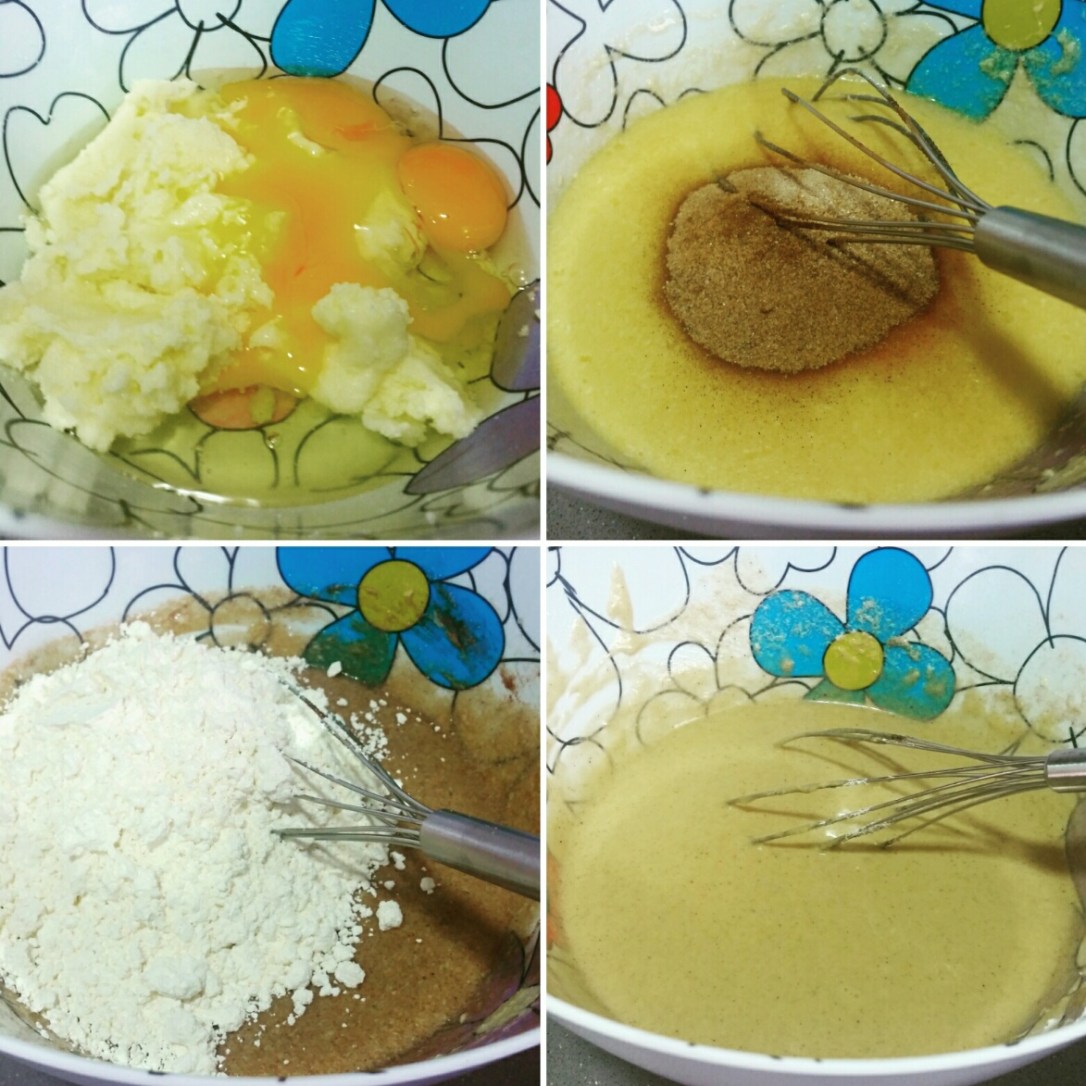 Ahora mezclamos la mantequilla con el azúcar. A esa masa le añadimos los 2 huevos y lo batimos todo bien. A continuación, echamos el azúcar vainillado y la cucharada de canela y seguimos mezclando.