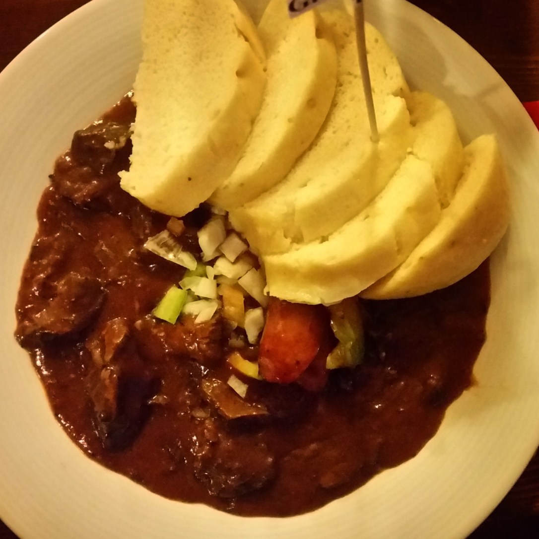 La primera noche fuimos a cenar a Svejk Restaurant U Karla, un sitio que vi recomendado en varios blogs. Y no decepcionó. Tienen una carta específica sin gluten y una cerveza buenísima. Yo, aparte, me decanté por el Beef Goulash que veis en la foto. Estaba muy bueno y el plato era tan contundente que casi salí rodando.