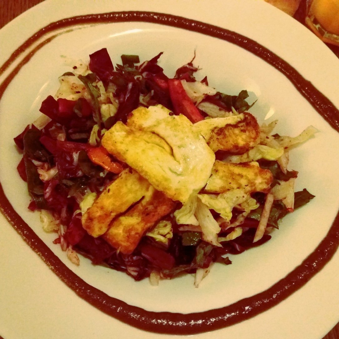 El segundo día fuimos a comer a Maitrea, un lugar muy acogedor y en cuya carta vienen bien indicados los platos aptos. La camarera fue además bastante clara diciendo que van con mucho cuidado y que si pone sin gluten, pues es sin gluten. Yo pedí una ensalada con queso tostado que, de nuevo, era bastante contundente. No tienen cerveza, pero disponen de una buena cantidad de zumos naturales muy buenos.