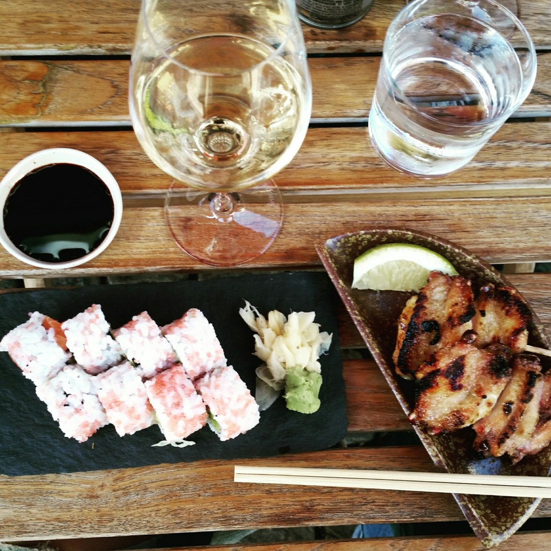 La primera es Sticks’n’Sushi. Como deduciréis por su nombre, se trata de un japonés también especializado en sticks o pinchitos. Pedí unos makis y unos sticks de pollo que estaban muy buenos (confieso que a mí el sushi me pierde), y también tenían salsa de soja y cerveza sin gluten (aunque yo pedí una copa de vino). Todo ello sale por unos 25 euros. No es barato, pero para los precios de Dinamarca, no está mal.